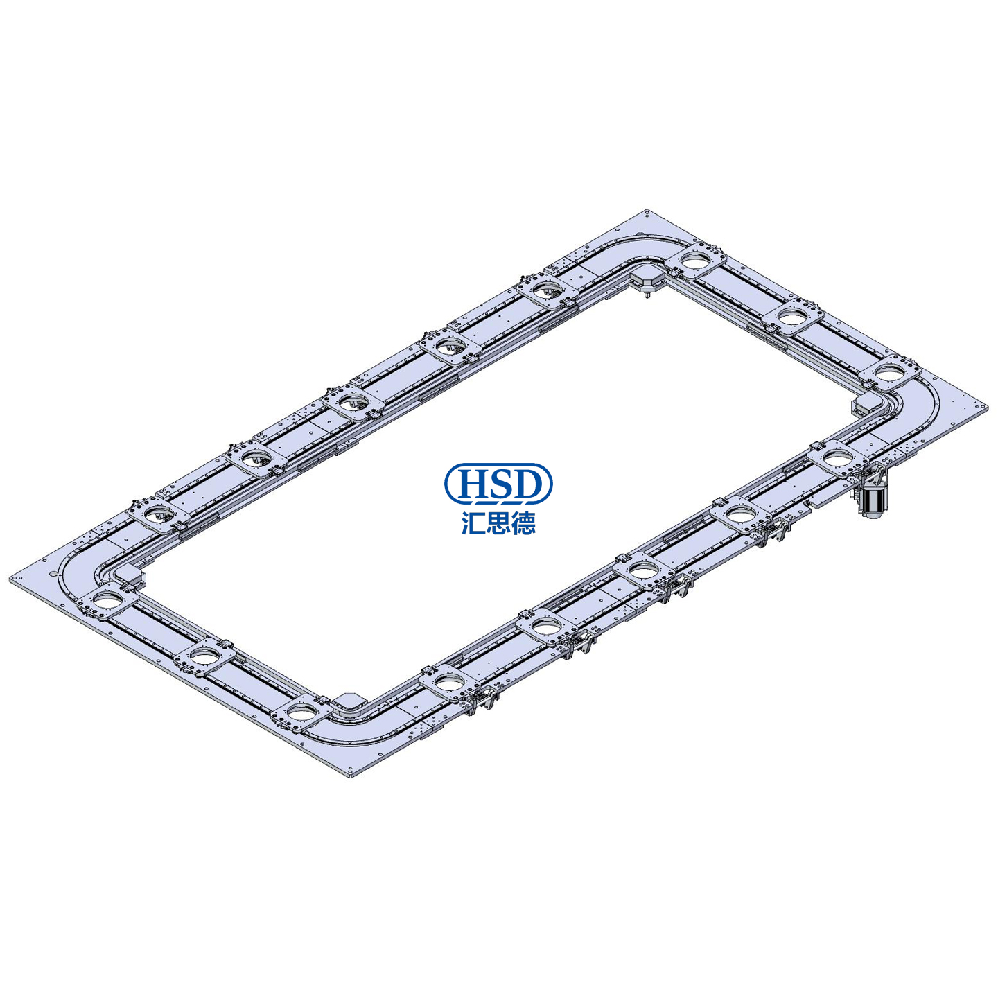 定制水平内外双轨环形导轨输送线,矩形循环回转输送,25mm截面V型导轨,16工位10定位,工位间距647.7mm,内圆弧直径255mm,外圆弧直径600mm,12A链条传动,2000W伺服电机,重复定位精度±0.1mm,水平内外双轨环形导轨输送系统单工位负载 30-50 kg,底板基座结构双轨环形导轨循环线解决方案3D模型。
